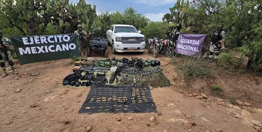 Entre los objetos asegurados se encuentran 5 armas largas, 4 granadas artesanales, una posible granada de gas, cargadores y cartuchos, así como una camioneta GMC Sierra, 2 motocicletas y 1 cuatrimoto. Además, se confiscaron 45 ponchallantas y diverso equipo táctico.