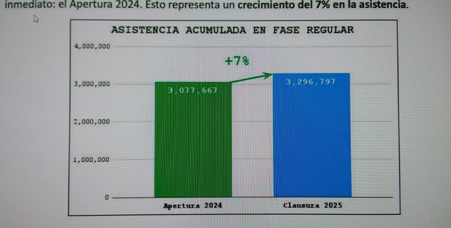 La asistencia en los estadios creció en las 17 jornadas fue de 3,296,797 aficionados, creció 7% el interés de los aficionados por presenciar los partidos, respecto del torneo anterior, Apertura 2024.