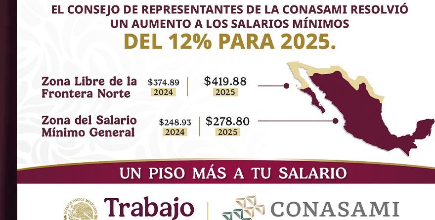 El Secretario del Trabajo, Marath Bolaños, informó que el salario mínimo en la zona libre de la frontera norte pasará de 374.89 a 419.88 pesos diarios, mientras que en la zona general, aumentará de 248.93 a 278.80 pesos al día.