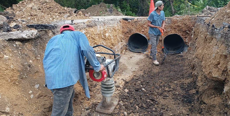 La JEC realiza corte del ancho de la corona de la carpeta, excavación y retiro de los daños, aplicar una cama de arena y un tubo de obra hidráulica, rellenar y volver a colocar la carpeta.