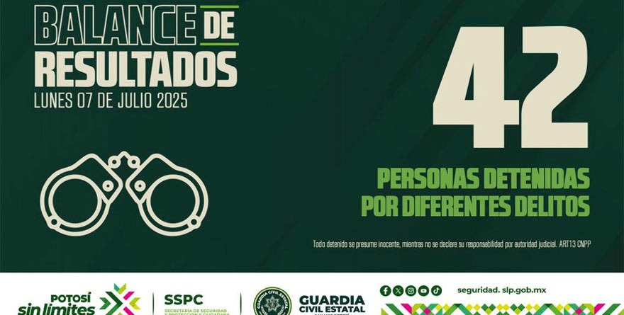 San Luis, SLP, 07 julio 2025.- Acciones contundentes de la #GCE para continuar sin límites en la construcción del orden y tranquilidad de la entidad, derivaron en la detención de 42 personas en las últimas 24 horas por su presunto involucramiento en diferentes hechos delictivos.