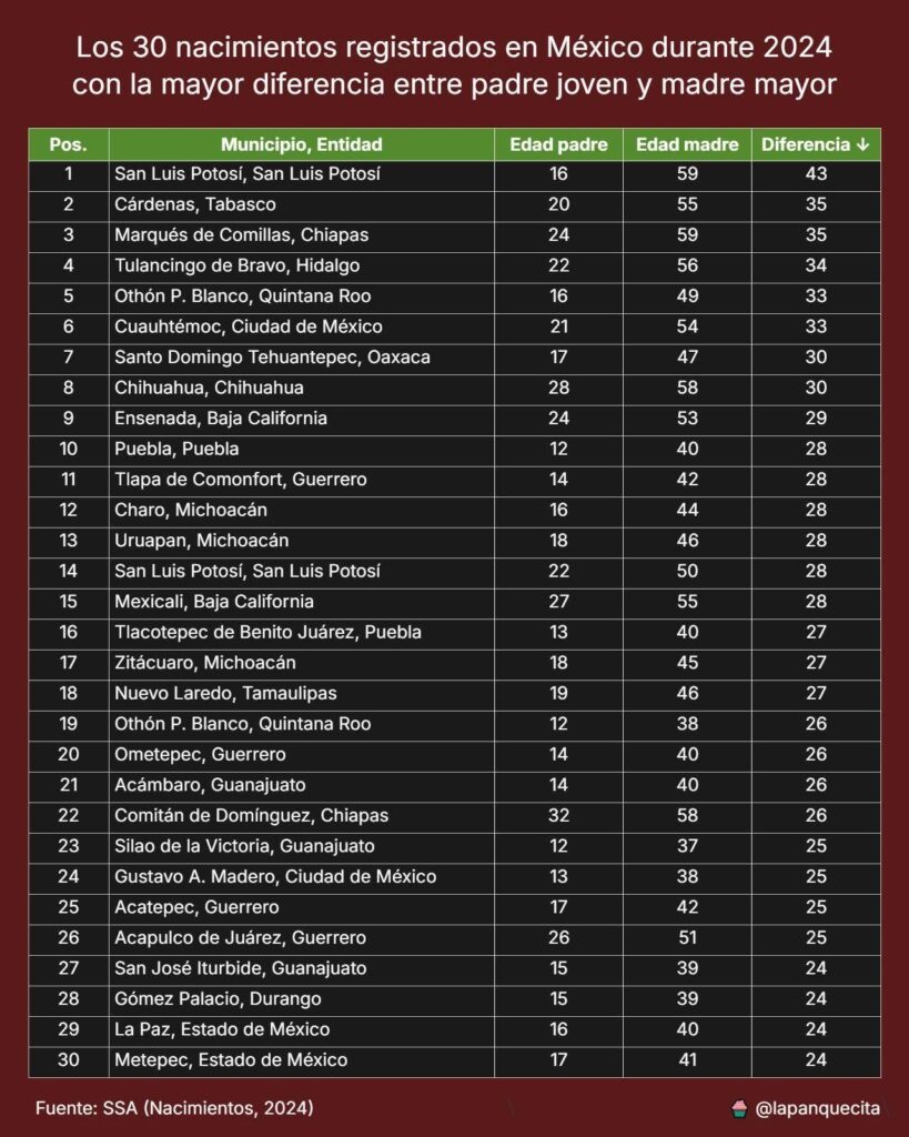 De los casos más extremos registrados en el 2024 fue el ocurrido en la capital potosina, done una mujer de 59 años mantenía una relación con un adolescente de apenas 16 años, con 43 años de diferencia entre ambos. Otro caso fue el de un joven de 20 años que encontró el amor en una dama de 55 años, con 35 años de diferencia, esto, en Cárdenas, Tabasco.