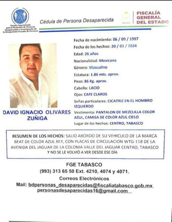 La Fiscalía General del Estado de Tabasco emitió una ficha de búsqueda en la que detalla que el pasado 20 de marzo, el socio de Sánchez Zumaya salió de un domicilio en el centro de Villahermosa a bordo de su auto Beat, Chevrolet y no se le volvió a ver.