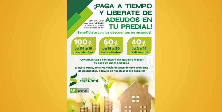 Soledad de Graciano Sánchez, SLP, 2 noviembre 2024.- En la segunda sesión ordinaria de Cabildo del Ayuntamiento de Soledad de Graciano Sánchez, fue aprobado la iniciativa para otorgar descuentos en recargos del impuesto predial a las y los contribuyentes, para predios destinados a casa habitación y baldíos con una superficie no mayor a 200 metros cuadrados; lo cual, fortalece el acercamiento con la ciudadanía a través de facilidades para regularizar sus trámites.