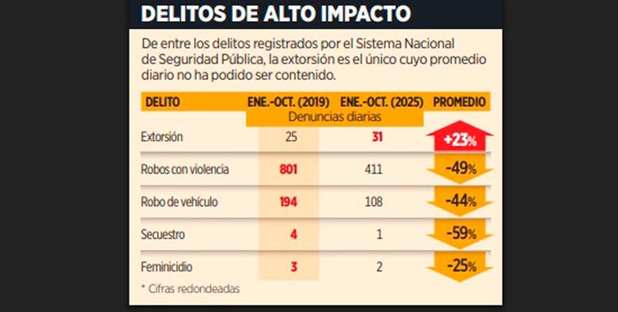 Ciudad de México 12 noviembre 2025.- A pesar de la implementación de una Estrategia Nacional, la extorsión se mantiene por encima de los niveles registrados en 2019, al mostrar un incremento acumulado de casi 23 por ciento entre enero-octubre de 2019 y el mismo periodo de 2025.