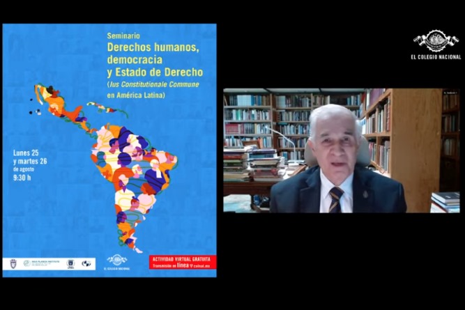 En su participación, Diego Valadés, miembro de El Colegio Nacional, reconoció la importancia que tiene y ha tenido la presencia del Instituto Max Planck en las deliberaciones que se han llevado a cabo durante ya varias décadas asociadas a problemas relacionados con el Ius Constitucionale Commune, “un gran movimiento que se ocupa y preocupa por los problemas del derecho constitucional común” y, ahora, mucho más con una triada de los derechos humanos, la democracia y el estado de derecho.