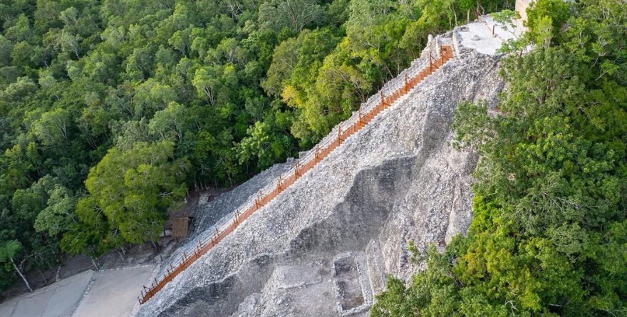 El corazón del sitio es el Templo de los Mascarones, con seis esculturas monumentales en estuco que aún conservan trazos rojos y negros. A su alrededor, sacbés enlazan plazas, residencias y un juego de pelota que parece esperar rivales, recordando la grandeza de una ciudad que aún guarda secretos.