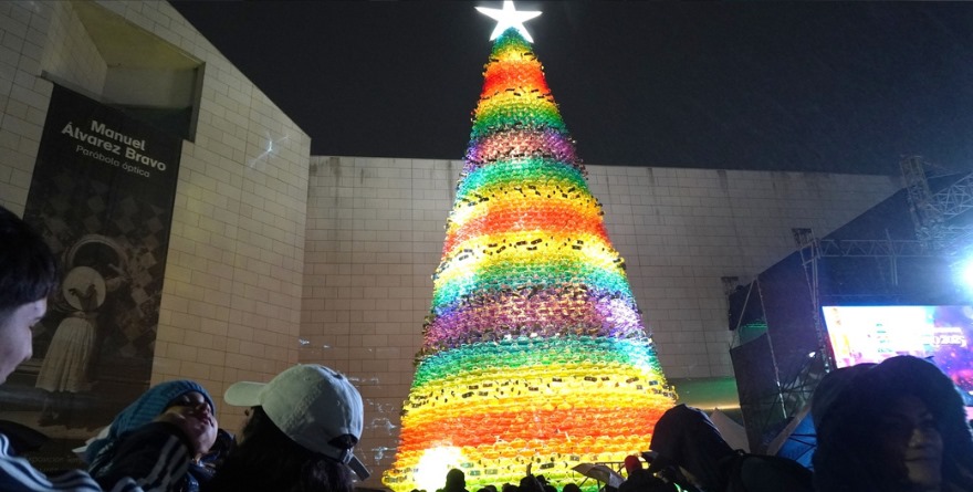 El Pino tiene 23 metros de altura y está cubierto por 4 mil 500 bolsas multicolores, ya utilizadas el año pasado, pero ahora formando un diseño inspirado en el sarape.