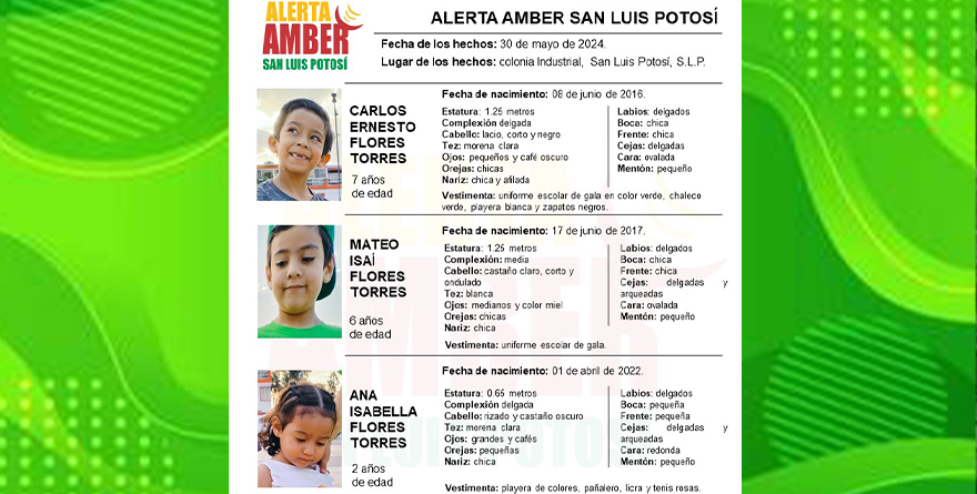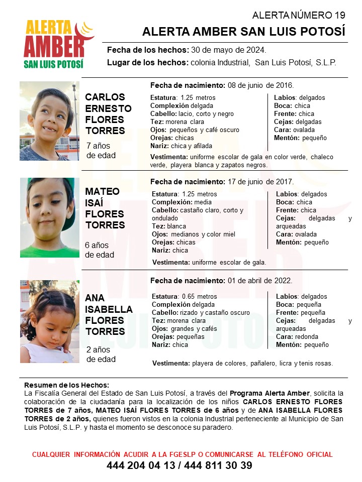 San Luis, SLP 18 julio 2024.- La Fiscalía General del Estado de San Luis Potosí (FGESLP) activó una Alerta Amber para localizar a los menores y hermanos Carlos Ernesto Flores Torres, Mateo Isaí Flores Torres y Ana Isabella Flores Torres, de 7, 6 y 2 años de edad respectivamente.
