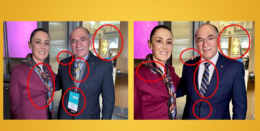 El montaje se delata en varios detalles. En la imagen original, Galindo porta una corbata con patrón de cuadros y rombos en tonos marrones y amarillos, mientras que en la versión difundida aparece con una corbata distinta, de rayas amarillas y azules. El fondo también fue alterado mediante desenfoque para ocultar la recepción y a los asistentes que aparecen detrás en la fotografía real. Incluso los lentes que llevaba el edil fueron eliminados digitalmente y se añadió la aparente mano de la presidenta tocando su hombro, gesto que en la imagen auténtica simplemente no existe. A ello se suma la eliminación de los gafetes del evento, aunque todavía se alcanza a distinguir el cordón colgando del cuello de la mandataria.