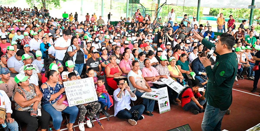 En medio del júbilo de mujeres y hombres de diferentes edades, y diversos oficios y trabajos,  Gallardo Cardona anunció que el programa contempla varias etapas, iniciando con la entrega de lotes, seguida por paquetes de materiales de construcción y culminando con la entrega gratuita de escrituras, garantizando así certeza jurídica y patrimonial para las familias beneficiarias.