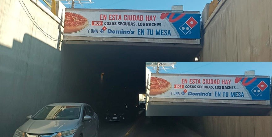 San Luis, SLP, 26 julio 2025.- Cuando una cadena de comida rápida de nivel internacional se burla de tu ciudad, es que de verdad ya tienes un problema. Tal situación le ocurrió al alcalde viajero de San Luis Potosí, Enrique Galindo Ceballos, que, por sus omisiones de reparar las calles y avenida de la capital potosina, Domino´s Pizza colocó un anuncio en el desnivel vehicular de avenida Muñoz haciendo referencia a los baches que, seguramente, sus repartidores en motocicleta sufren cuando tienen que llevar los pedidos a las casas.