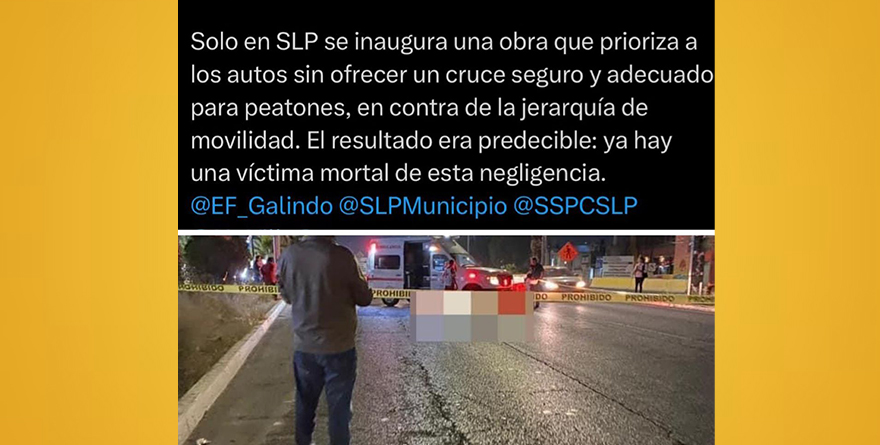 “Solo en SLP se inaugura una obra que prioriza los autos sin ofrecer un cruce seguro y adecuado para peatones, en contra de la jerarquía de movilidad. El resultado era predecible: ya hay una víctima mortal de esta negligencia”, comentaron en una cuenta de X refiriéndose al suceso del atropellamiento de la persona, caso que podría repetirse si el alcalde viajero, Enrique Galindo Ceballos, continúa su indiferencia por la seguridad de todos los capitalinos.