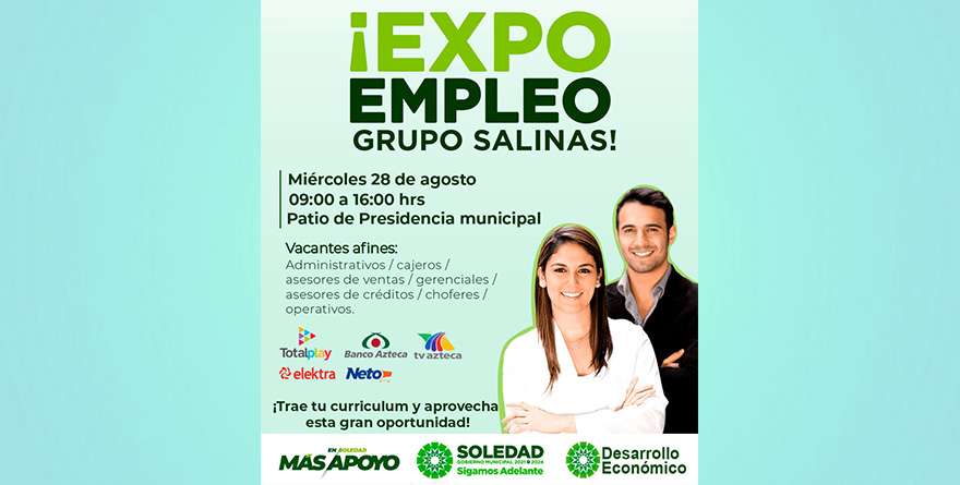 Soledad de Graciano Sánchez, SLP, 27 agosto 2024.- Para acercar más oportunidades laborales a las y los soledenses, y fomentar la inclusión a un empleo digno y acorde a las capacidades personales, este miércoles 28 de agosto, el Ayuntamiento de Soledad de Graciano Sánchez, a través de la Dirección de Desarrollo Económico, llevará a cabo una Feria de Empleo en el patio de la Presidencia municipal, en colaboración con Grupo Salinas.