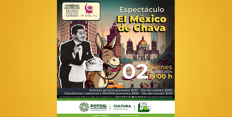 San Luis, SLP 30 julio 2024.- El Gobierno del Estado a través de la Secretaría de Cultura, el Museo Francisco Cossío y Desarrollo Integral Ix Chel A. C. invitan a las familias potosinas al espectáculo multidisciplinario “El México de Chava” este viernes 02 de agosto a las 19:00 h.