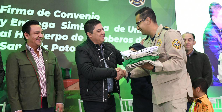 San Luis, SLP, 16 enero 2025.- En apoyo a las y los potosinos que forma parte del H. Cuerpo de Bomberos Voluntarios de San Luis Potosí, este jueves el Gobernador del Estado, Ricardo Gallardo Cardona, formalizó el convenio para respaldar a integrantes de este grupo de auxilio y sus familiares, en caso de afectaciones graves en el cumplimiento de su servicio que desarrollen en el territorio del Estado, además de entregar uniformes completos para dignificar su trabajo y brindarles protección ante cualquier eventualidad.