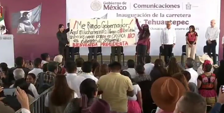Acompañada de su hermana, la saxofonista mostró una pancarta con la leyenda “¡Me rindo gobernador! Aquí mi lucha termina, ustedes liberaron a Vera Carrizal, porque en Oaxaca no es tiempo de mujeres, ¡bienvenida presidenta!”, con colores negro y rojo como manifestación.