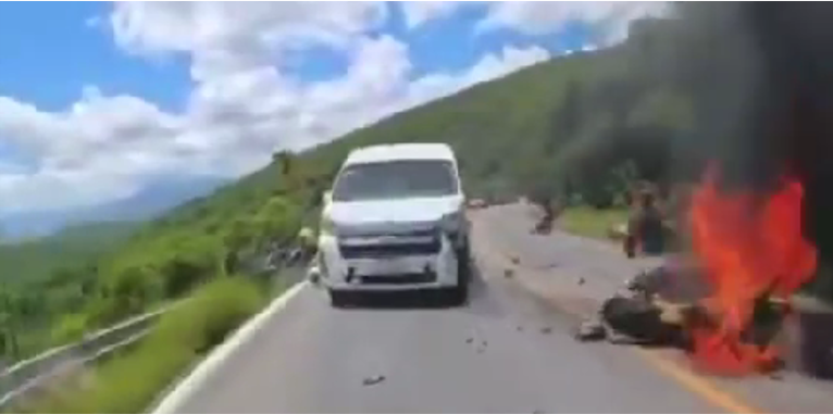 San Luis, SLP, 20 julio 2025.- Se registró fuerte accidente en la carretera libre a Rioverde, a la altura de Santa Catarina; dos motociclistas chocaron contra camioneta y se encuentran graves, sus unidades se incendiaron.