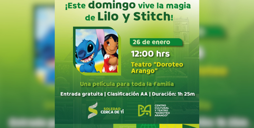 – Este domingo 26 de enero, se presenta la película «Lilo y Stitch», en punto de las 12:00 horas en el Teatro «Doroteo Arango».