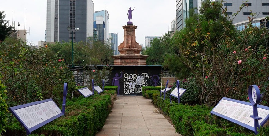 El pedestal que sostenía las efigies del navegante y de los referidos frailes es, desde 2021, la base de la antimonumenta «Justicia» -silueta de una mujer con el puño izquierdo en alto-, que ha transformado la antigua Glorieta de Colón en la Glorieta de las Mujeres que Luchan, espacio feminista de resistencia y de memoria de las víctimas contra la violencia de género. Esta acción tuvo el respaldo de Amnistía Internacional en 2023.