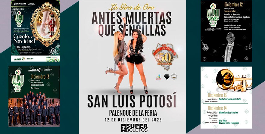 Este viernes el Palenque de la Feria Nacional Potosina (Fenapo) recibe la gira de oro “Antes Muertas Que Sencillas”, mientras que el Teatro de la Paz presentará el Concierto Navideño de la Orquesta Sinfónica de San Luis Potosí, bajo la dirección de Enrique Barrios, a las 20:00 horas.