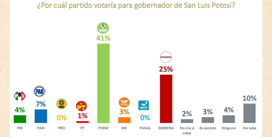 Según el estudio de opinión pública, el PVEM encabeza las preferencias electorales con un 41% de intención de voto para la gubernatura del estado, muy por encima de sus competidores más cercanos: Morena, con 25%, y el PAN, con apenas 7%. Esta ventaja refleja una tendencia que se ha consolidado desde el triunfo en 2021 con Ricardo Gallardo Cardona, y que se reafirmó en 2024 al posicionarse como la principal fuerza en San Luis Potosí.
