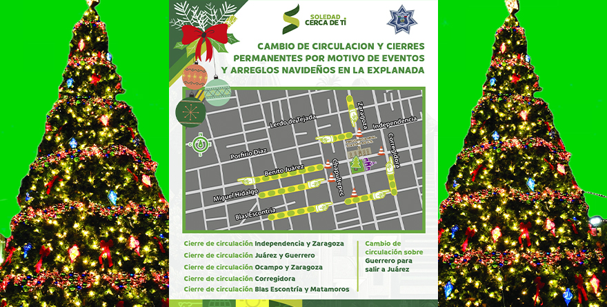 Soledad de Graciano Sánchez, SLP, 29 noviembre 2024.- Con el inicio de los festejos decembrinos y las actividades que se llevarán a cabo en la demarcación, Policía Vial de Soledad de Graciano Sánchez informó que se realizarán desviaciones y cierre de vialidades en el primer cuadro del centro histórico de la Cabecera municipal, a partir de este viernes 29 de noviembre.