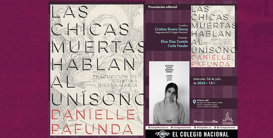 Ahora, con el mismo sello editorial, publica Las chicas muertas hablan al unísono, poemario de la estadounidense Danielle Pafunda. Con esta reciente traducción, la integrante de El Colegio Nacional completa una trilogía centrada en el dolor y la denuncia. En la presentación de estas novedades participarán las poetas Eliza Díaz Castelo (Premio Bellas Artes de Poesía Aguascalientes 2020 por El reino de lo no lineal) y Carla Faesler (Premio Nacional de Literatura Gilberto Owen 2002 por Anábasis Maqueta).