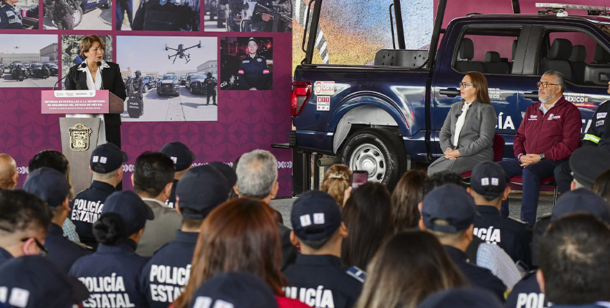 La Gobernadora Delfina Gómez Álvarez precisó que durante su administración ha reafirmado el compromiso con los elementos de la Policía Estatal, el primer paso fue la renivelación salarial, así como la entrega de uniformes y equipo táctico de primera calidad: chalecos balísticos, escudos, armas cortas y largas, fornituras de liberación rápida, botiquines médicos y otros implementos necesarios para su protección y desempeño.