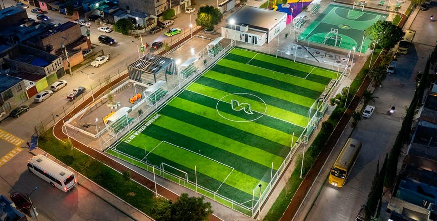 El Parque Urbano cuenta con cancha deportiva equipada con butacas, trotapista, juegos infantiles sobre pasto sintético, un módulo de usos múltiples y moderno sistema de iluminación LED y la integración de la purificadora gratuita atiende desde el primer día una necesidad básica de las y los soledenses con agua de calidad al alcance de todas y todos.