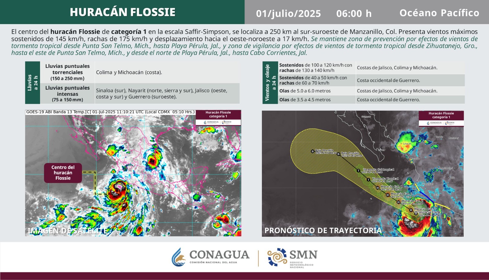 «Sus bandas nubosas junto con el arrastre de humedad que genera, mantendrá el pronóstico de lluvias torrenciales en la costa de Guerrero y el sur y la franja costera de Michoacán; intensas en Colima, el oeste y sur de Jalisco y el norte y suroeste de Oaxaca.