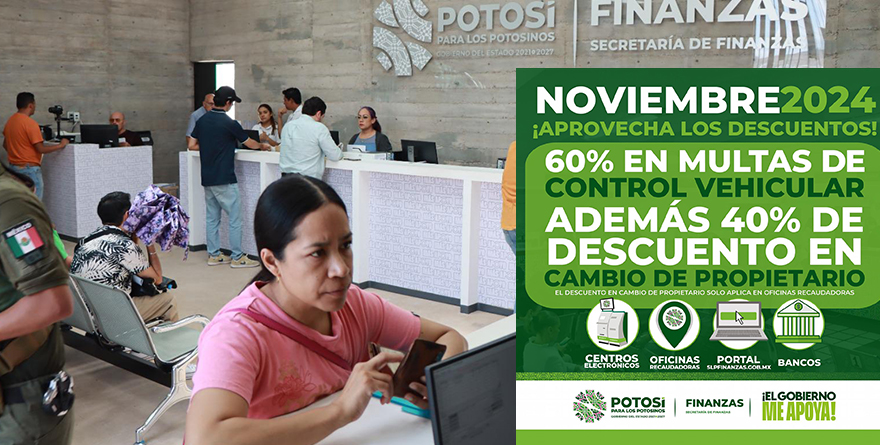 El programa de descuentos en cambio de propietario aplica en las recaudadoras de todo el Estado, y en la oficina ubicada en las instalaciones de la Feria Nacional Potosina (Fenapo), donde brindan atención los sábados y domingos con un horario de 8:00 a 15:00 horas, mientras que el 60 por ciento de descuento en multas de control vehicular, es aplicable en las recaudadoras y en medios digitales como centros electrónicos, el portal www.slpfinanzas.gob.mx e instituciones bancarias.