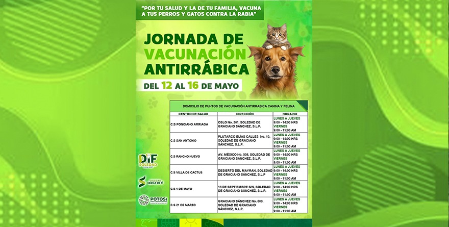 El Ayuntamiento de Soledad de Graciano Sánchez invita a las jornadas de vacunación antirrábica para mascotas, impulsada por el Gobierno del Estado, a través de los Servicios de Salud.