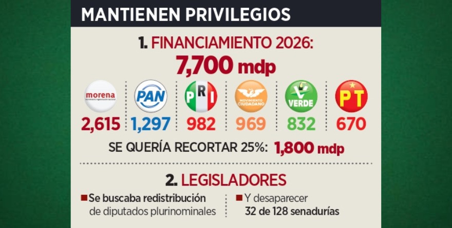 Para este año se proyectaron más de 7 mil 700 millones de pesos de financiamiento para los partidos políticos. Con la propuesta de Sheinbaum se buscaba recortar más de mil 800 millones de pesos.