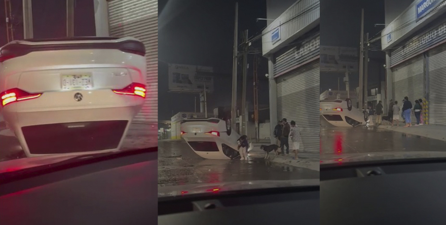 San Luis, SLP, 12 julio 2025.- Automovilista pierde el control de su unidad y termina volcado en acceso norte, próximo a carretera a Matehuala.