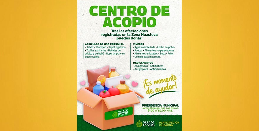 El director de Participación Ciudadana, Juan Marín Nava, explicó que, el centro de acopio se encuentra ubicado en la Presidencia Municipal de Villa de Pozos, en Jardín Hidalgo, colonia Los Olivos y permanecerá abierto de 8:00 a 15:00 horas para recibir donaciones de la ciudadanía.