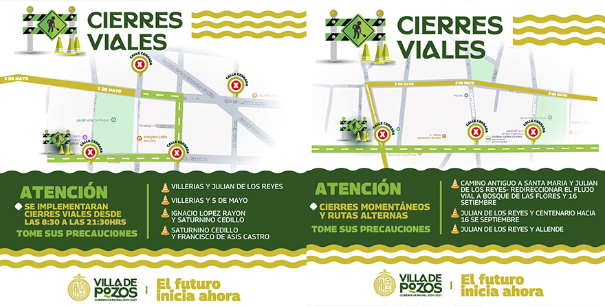 La dirección de Seguridad Pública municipal informa que se llevarán a cabo cierres viales en diferentes puntos estratégicos de la zona en un horario de 08:30 a 21:30 horas en las intersecciones de las calles Villerías y Julián de los Reyes, Villerías y 5 de mayo, Ignacio López Rayón y Saturnino Cedillo, y Saturnino Cedillo y Francisco de Asís Castro.